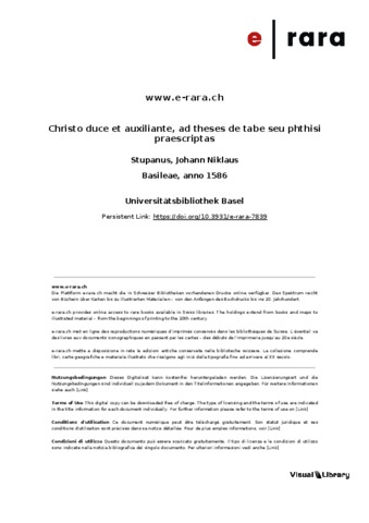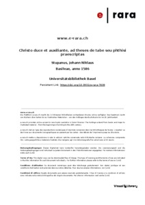Stupano, Giovanni Nicola and Axovinus, Iacobus Gregorius (1586) Christo duce et auxiliante, ad theses de tabe seu phthisi praescriptas / clarissimorum in celeberrima Academia Basiliensi dominorum medicorum, praeceptorumque dignissimorum voluntate, & praeside ... Iohanne Nicolao Stupano, philosopho ac medico prastantissimo existente, Iacobus Gregorii Taxovinus Pannonius, exercitii gratia conabitur respondere XV. Novembris anni partus salutiferi M.D.LXXXVI. hora locoque deputatis. Leonardus Ostenius, Basileae.