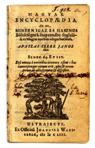 Apáczai Csere, János (1655) Magyar encyclopaedia : Az az, Minden igaz es hasznos Böltseségnek szep rendbe foglalása és Magyar nyelven világra botsátása / Apatzai Tsere Janos által. RMK I 876 ; RMK III 1941 ; RMNy 2617 . Ex Officinâ Joannis à Waesberge, Ultrajecti.